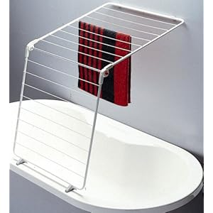 Das erste Bild (kann mir mal jemand den Schriftzug übersetzen?) zeigt eine typische Situation, so aufgestellt passt der Wäscheständer auch auf jede klassische Badewanne. Flach darüber gelegt, kann es recht wackelig werden.