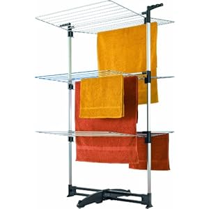Dieser Wäscheständer ist tatsächlich ein kleines Platzwunder. Er ist schnell aufgebaut, ist mit seinen ausziehbaren Füssen relativ stabil und durch die klappbaren Seitenteile - insgesamt 6 - sehr individuell zu variieren. Zusätzlich gibt es an jeder Seite noch eine Vorrichtung für Bügel zum hängen von empfindlichen Sachen.